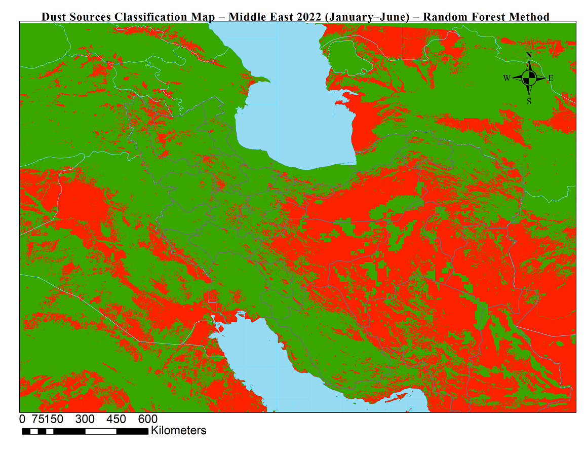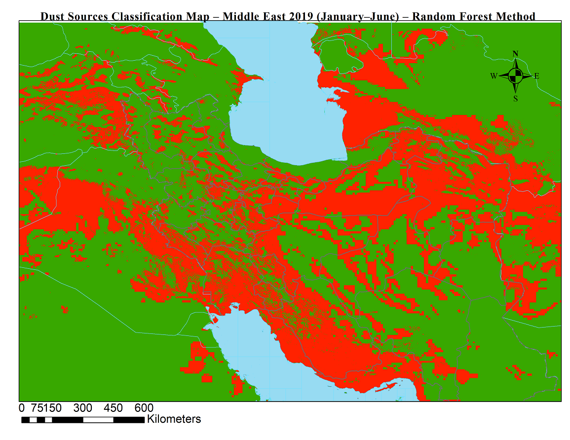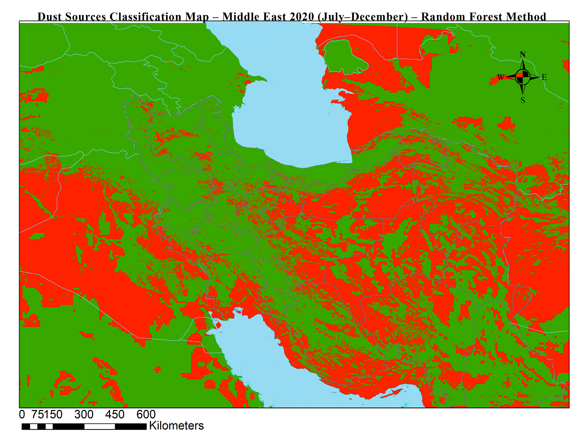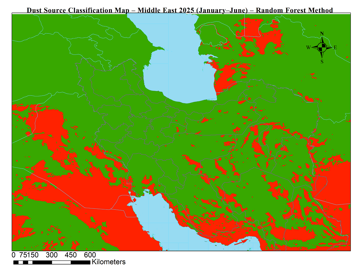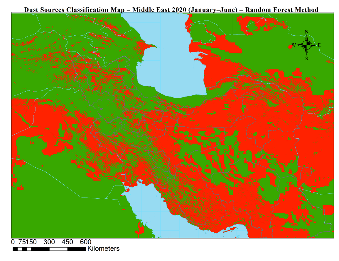 شناسایی موقعیت جغرافیایی چشمه های گردوخاک نقش بسزایی در پایش و پیش بینی طوفان های گردوخاک دارد. در این محصولات با استفاده از دادههای ماهوارهای (سنجش از دور) و الگوریتم جنگل تصادفی، چشمههای فعال تولید گردوخاک در خاورمیانه برای بازههای ششماهه شناسایی و طبقهبندی شدند.